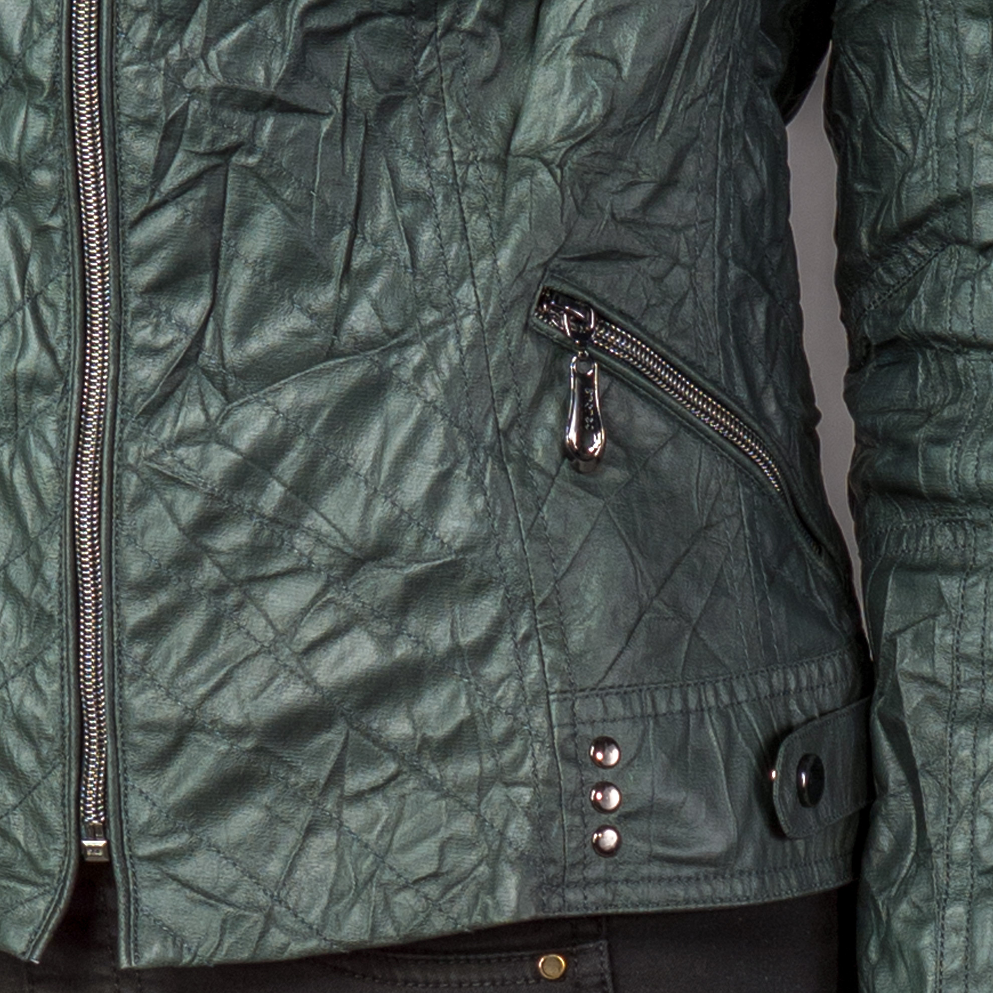 Jarní bunda se zajímavým mačkavým efektem, doplněna výraznými zipy.